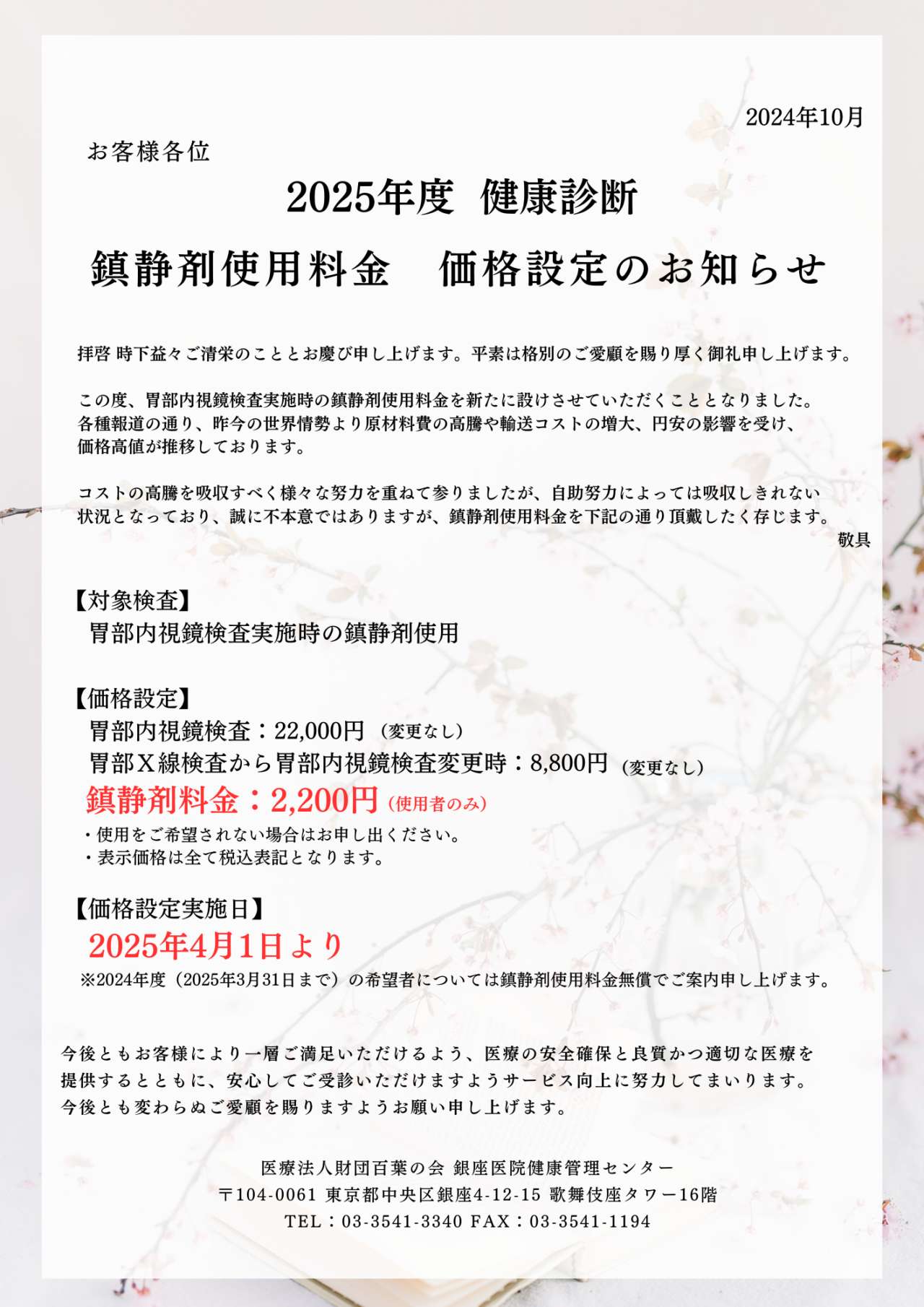 鎮静剤料金 価格設定のお知らせ
