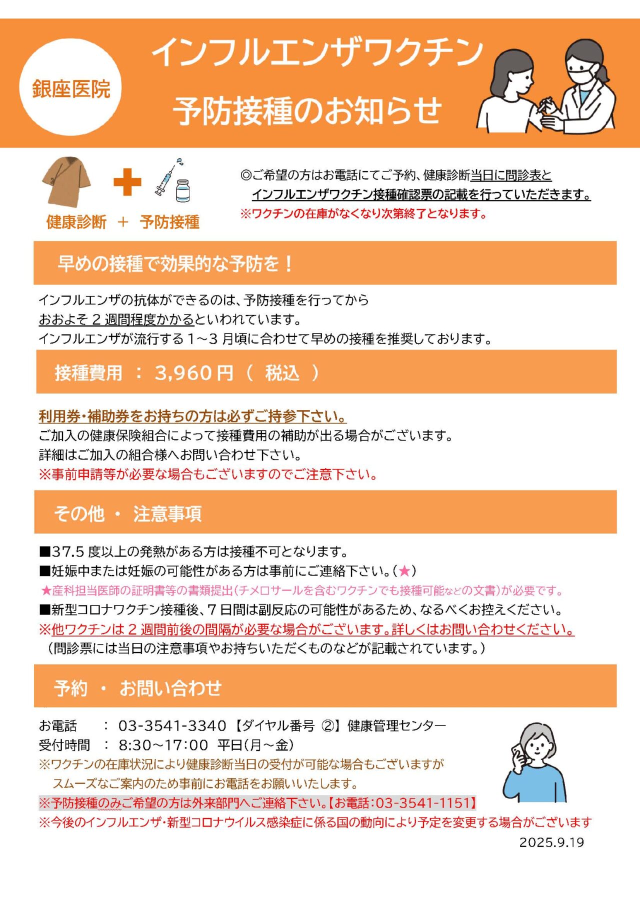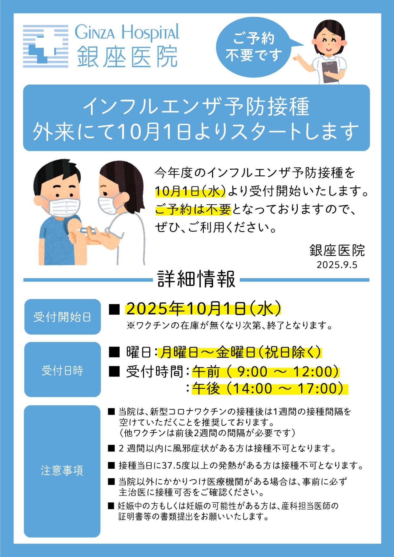 銀座医院では、2025年度のインフルエンザワクチン接種を10月1日(水)より開始いたします。